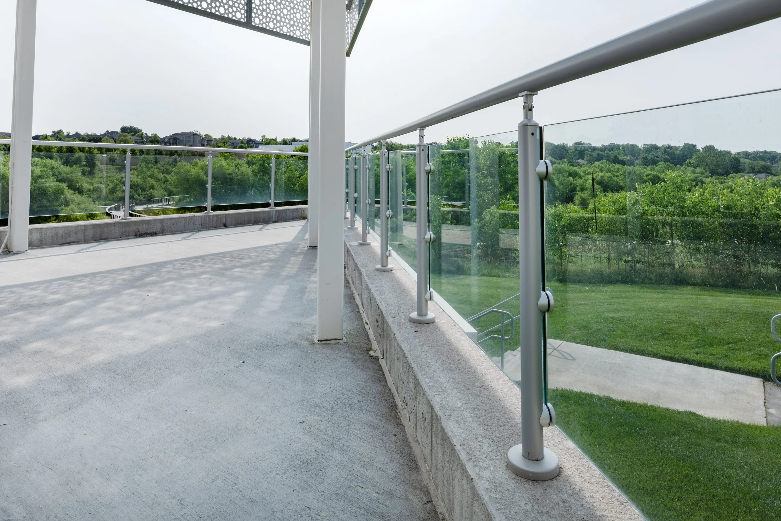 Glass railing on a balcony overlooking a green park with trees and a distant building.