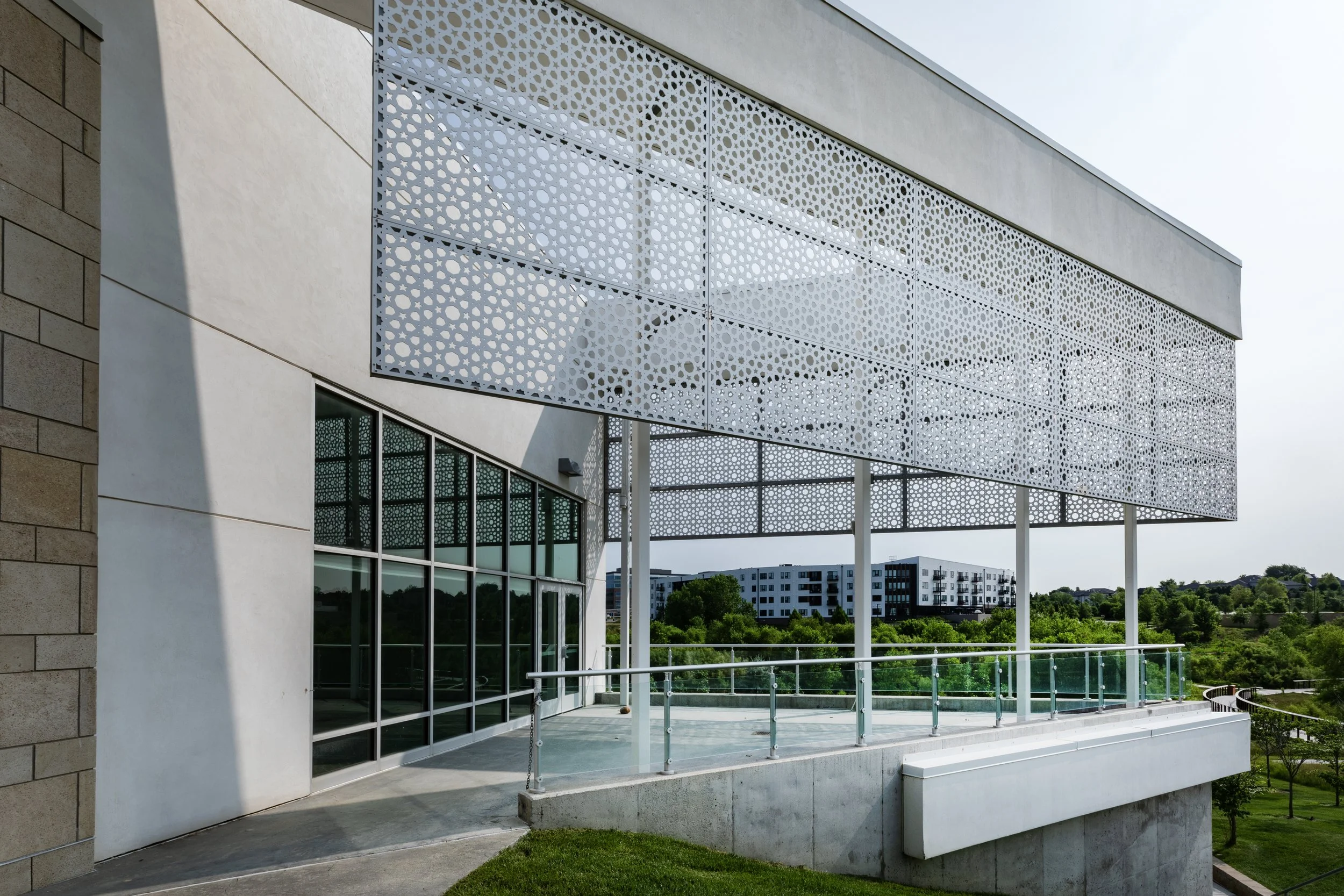 Modern building with geometric perforated facade panels and glass railings, overlooking a grassy landscape and distant buildings.