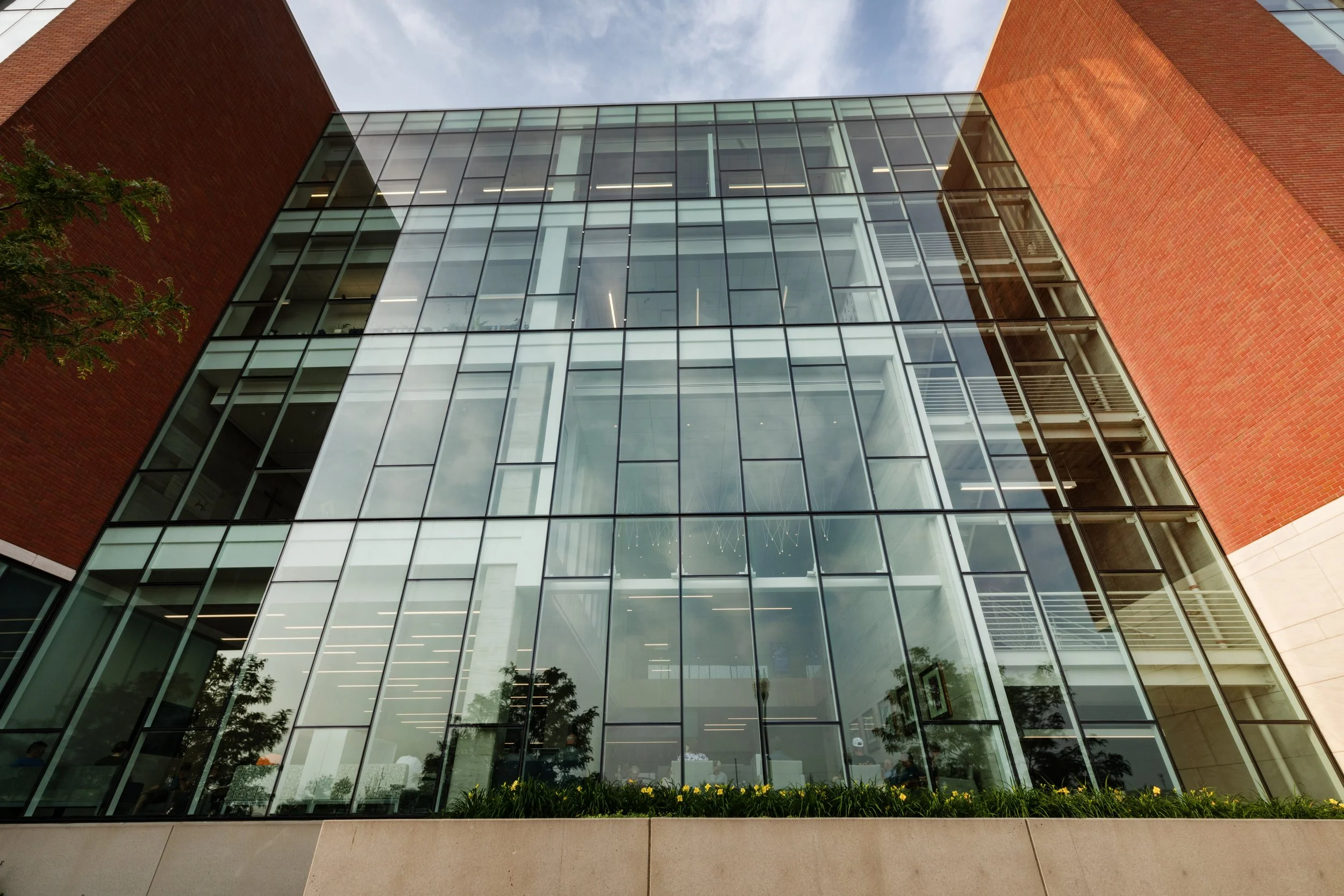 Brick building with large modern windows reflecting adjacent structures and trees, blue sky in background.