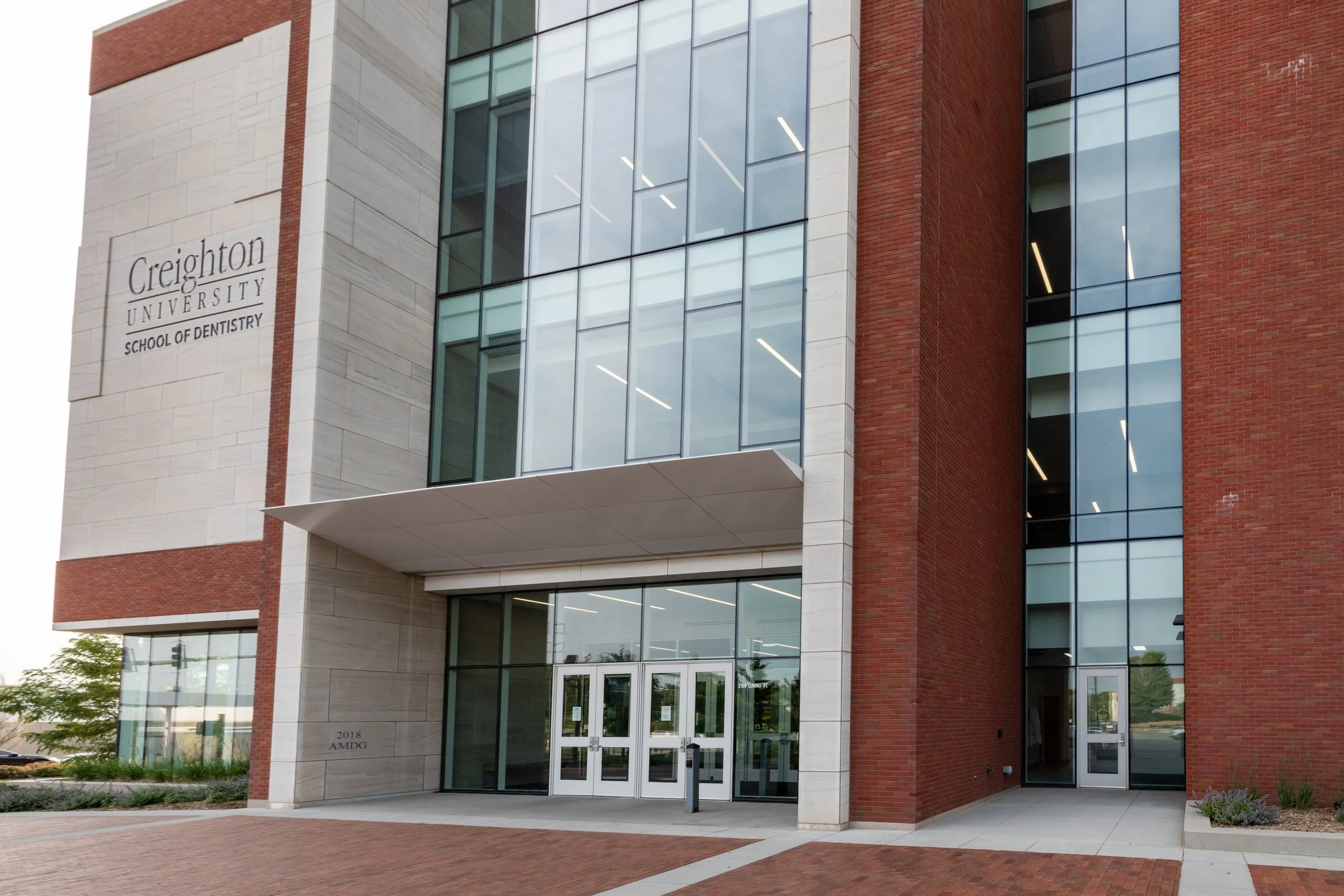 Exterior view of Creighton University School of Dentistry building with glass windows and red brick facade.