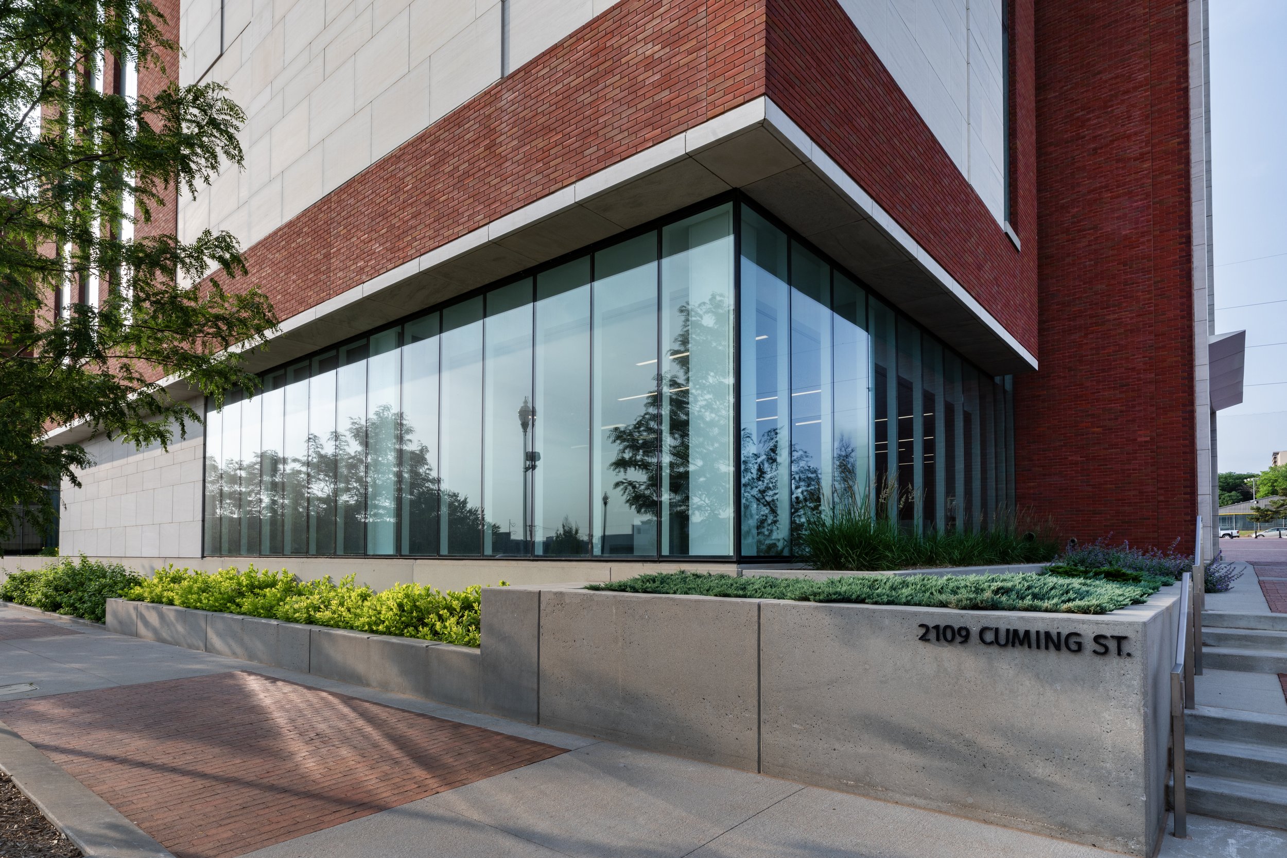 Modern building with glass windows and brick exterior at 2109 Cuming St, featuring landscaped greenery and sidewalk.