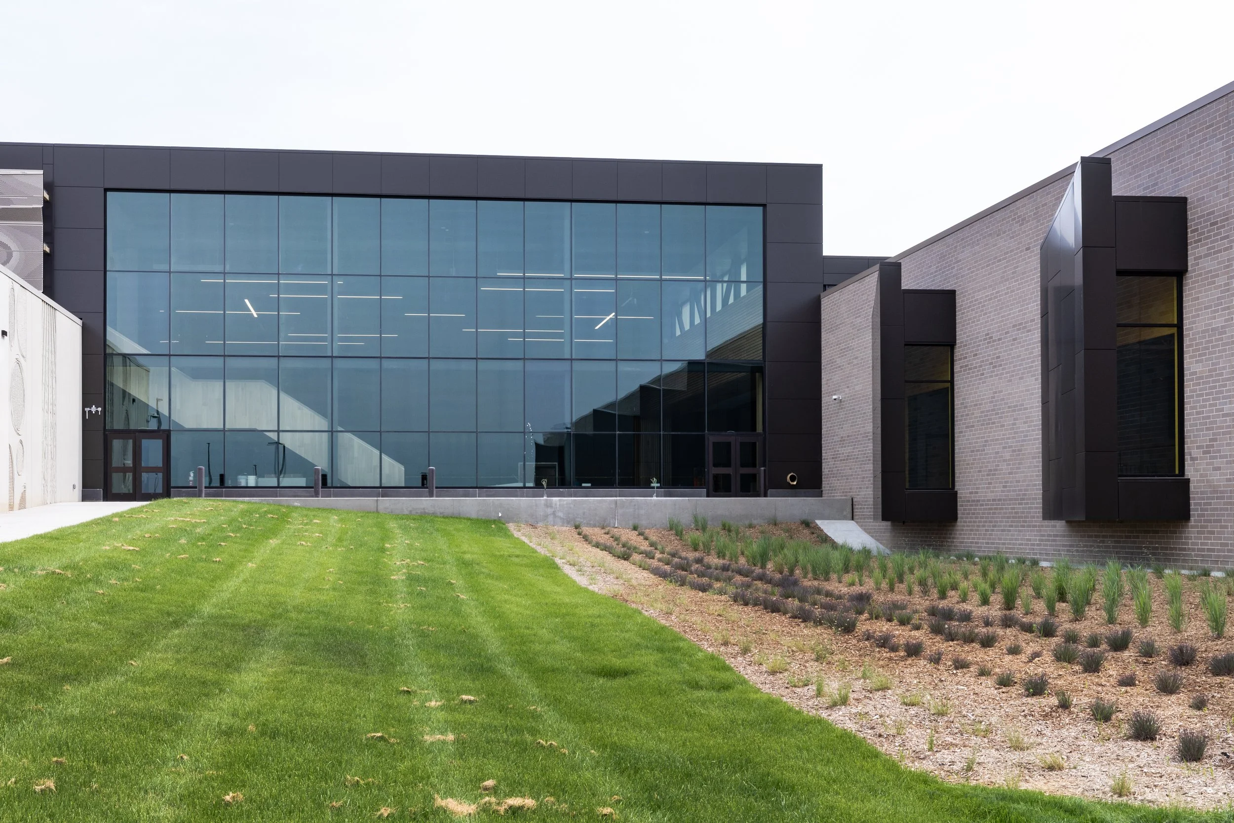 Modern building with brick and glass exterior, landscaped with young plants and mulch.