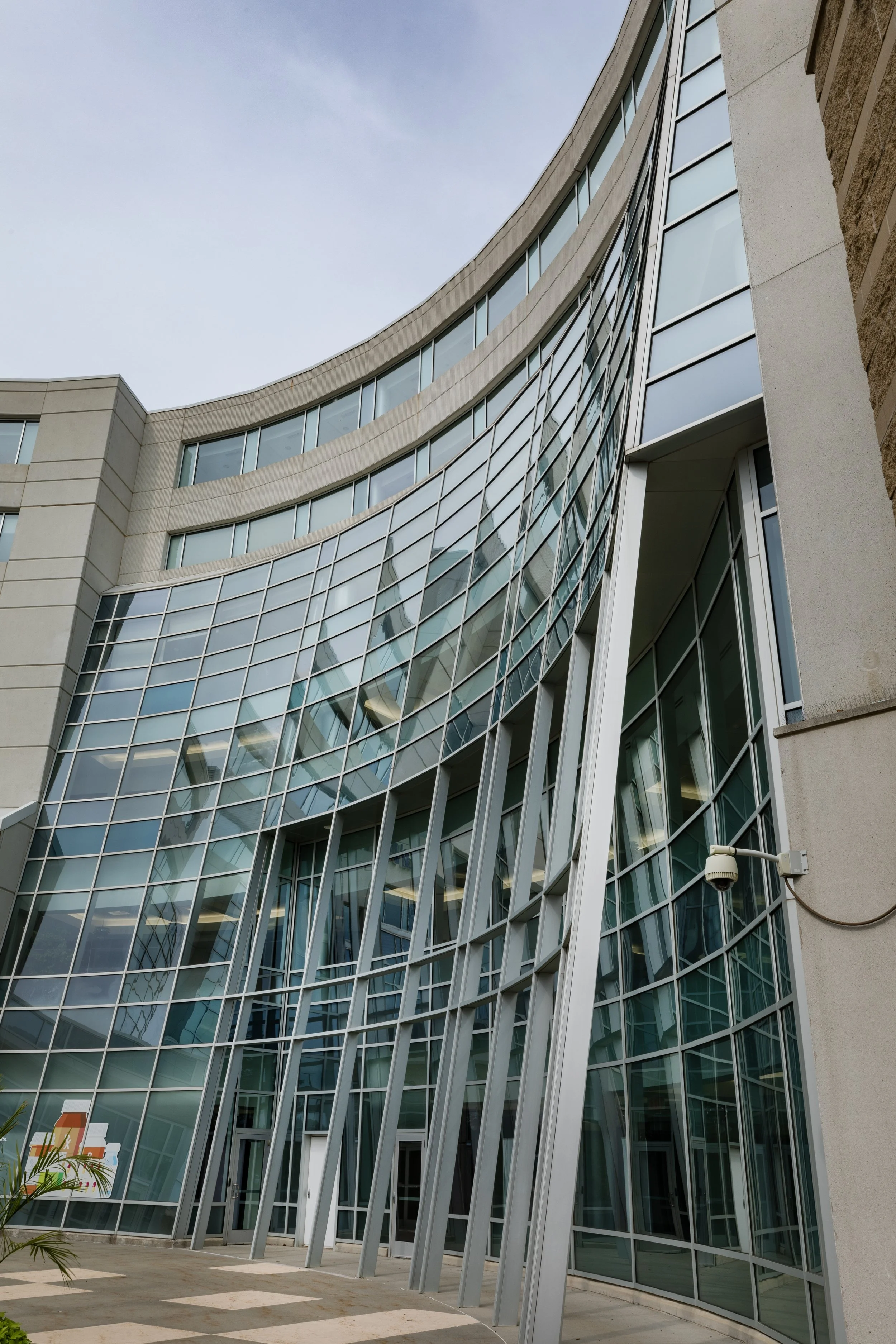 Curved glass facade of Medical Building One with flags flying in front.