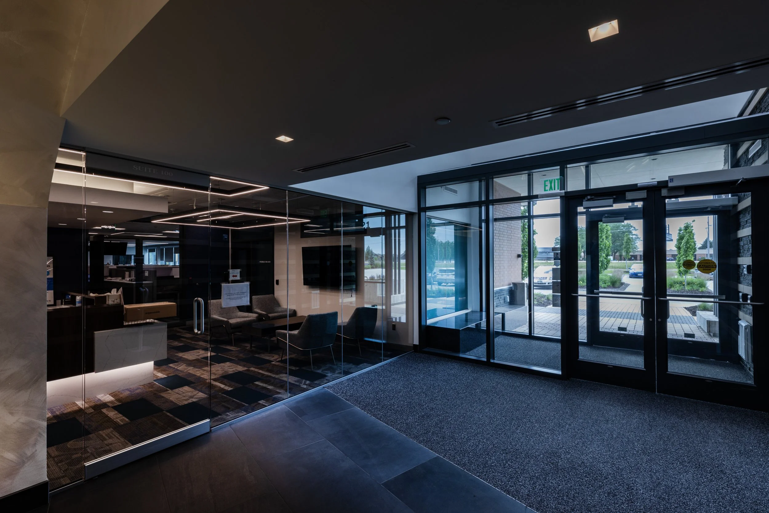 Modern office lobby with glass walls, seating area, and exterior glass doors leading outside.