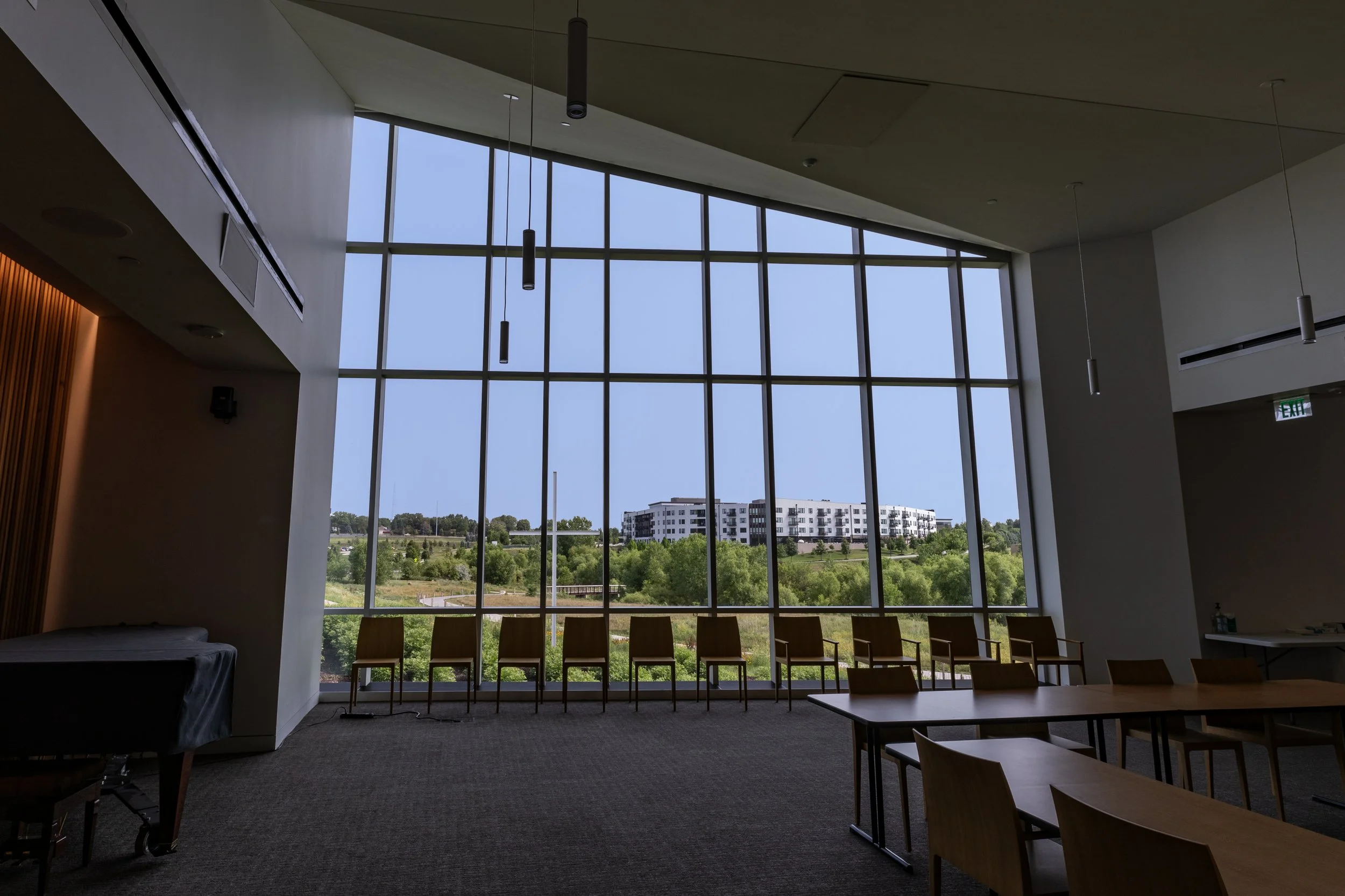 Modern interior with large windows, overlooking greenery and buildings, featuring chairs and tables in a meeting room setting.