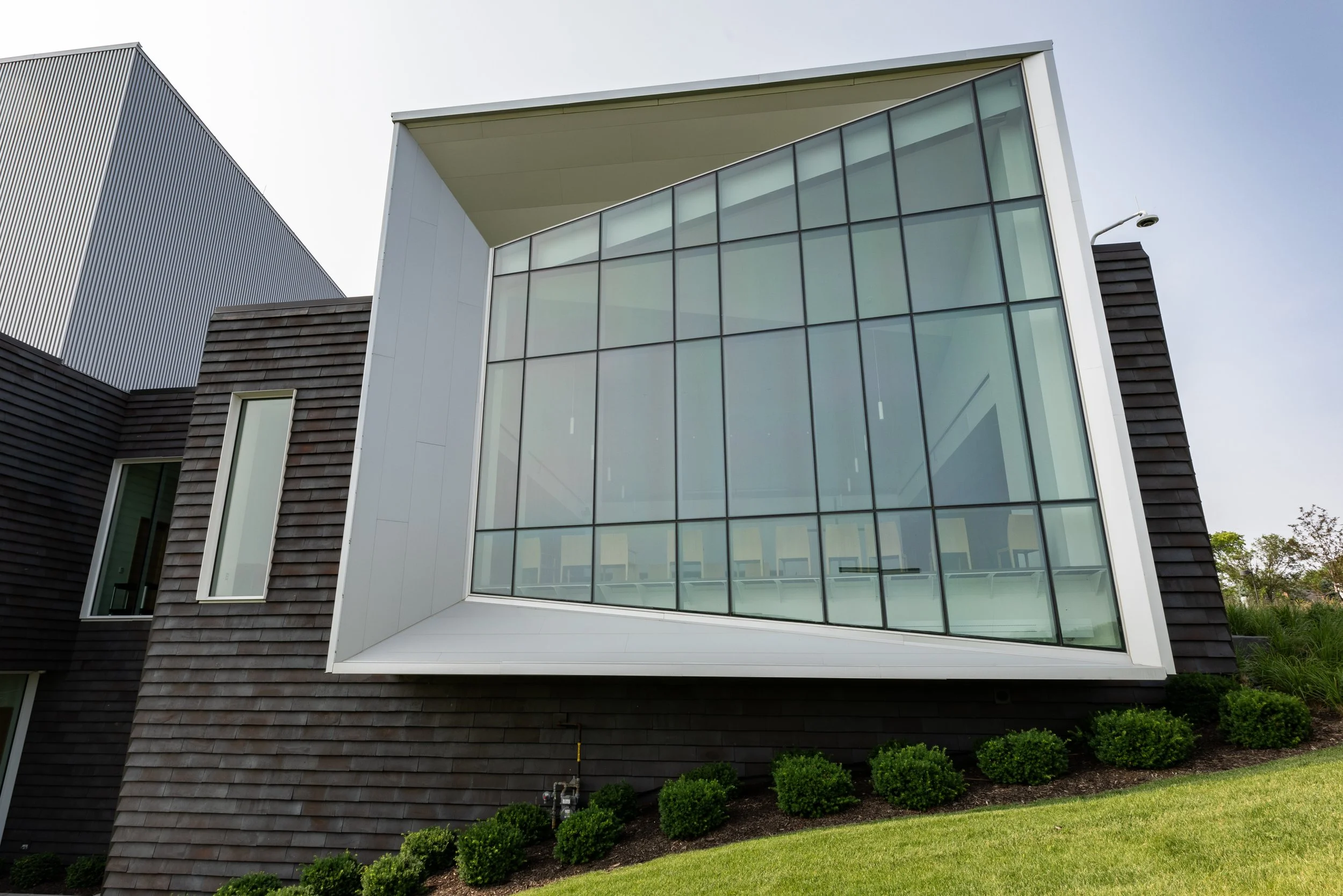 Modern building exterior with large angular glass windows and wooden siding