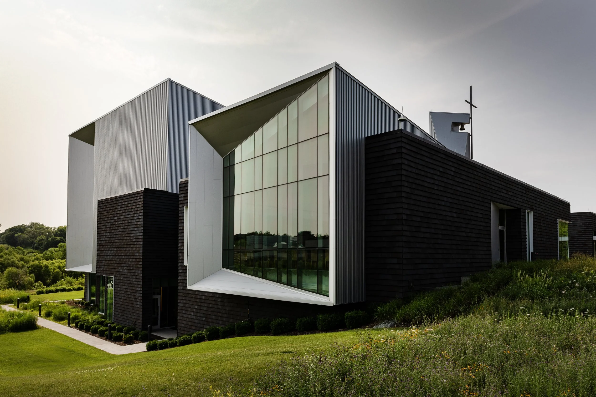Modern building with geometric architecture, large windows, and a metal cross on the roof, surrounded by greenery.