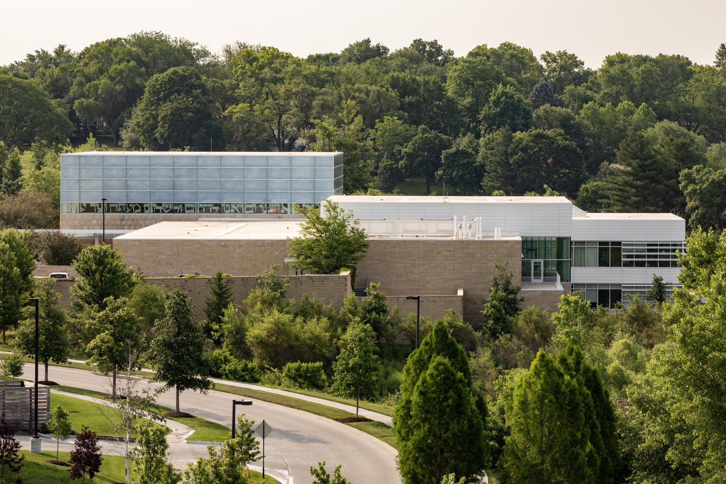 Modern building surrounded by trees, featuring large glass windows and a curved road in the foreground.