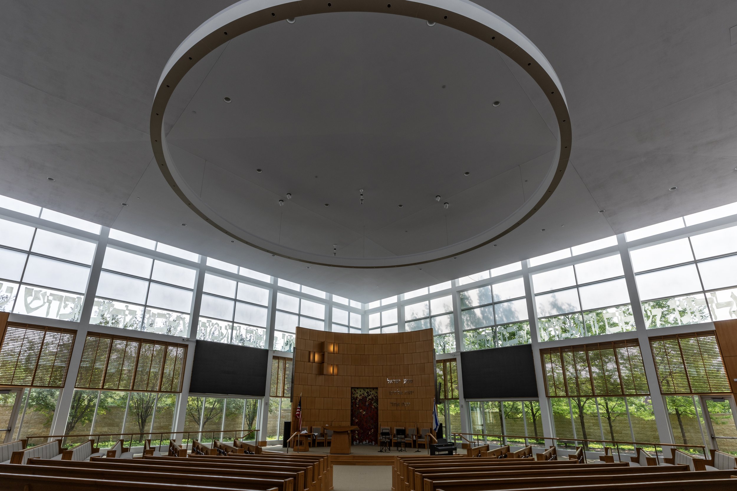 Interior of a modern synagogue with large windows, wooden benches, and a central platform with chairs. The architecture includes high ceilings and a decorative wall with Hebrew inscriptions. Natural light illuminates the room from the glass wall over