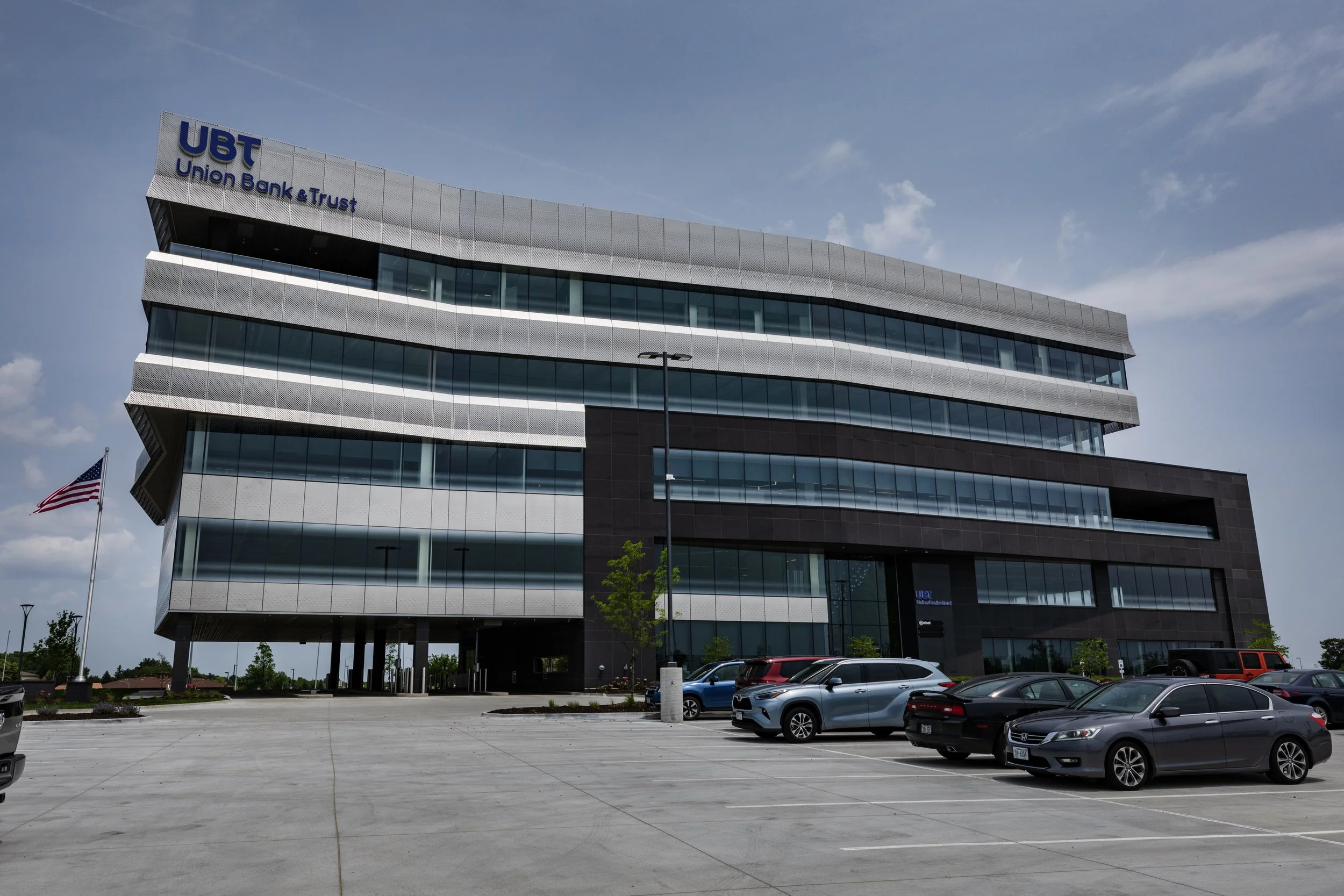 Modern office building exterior with glass entrance and UBT Union Bank & Trust logo.